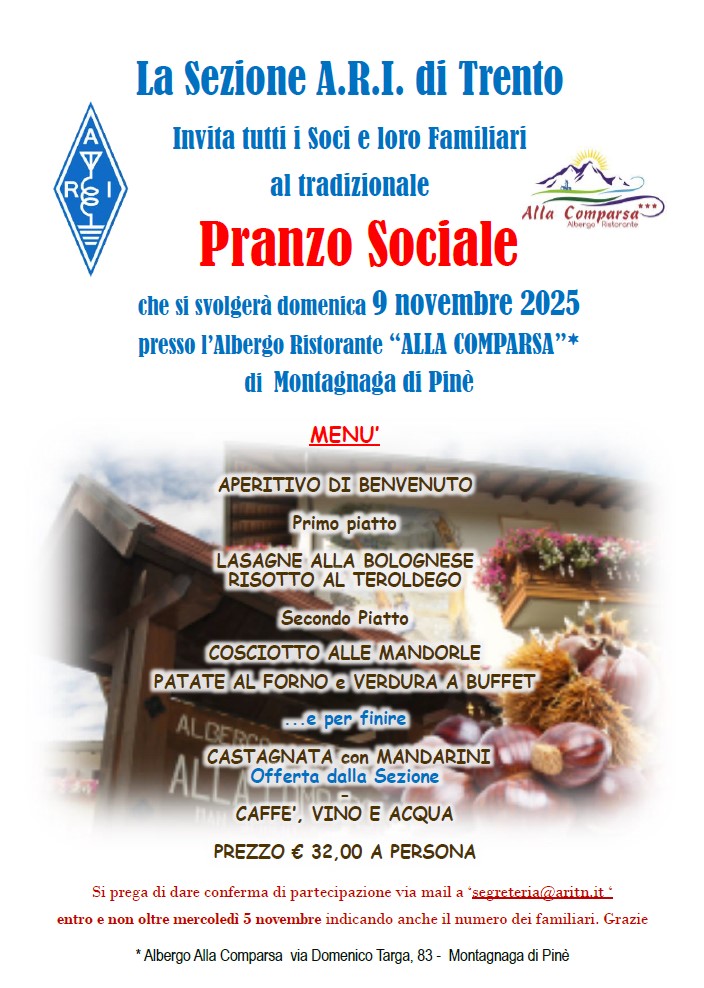 Domenica 9 novembre 2025 ci siamo ritrovati in molti tra soci, familiari e simpatizzanti presso il ristorante “Alla Comparsa” di Montagnaga di Pinè, per il tradizionale pranzo sociale che la seziona ARI di Trento organizza tutti gli anni.